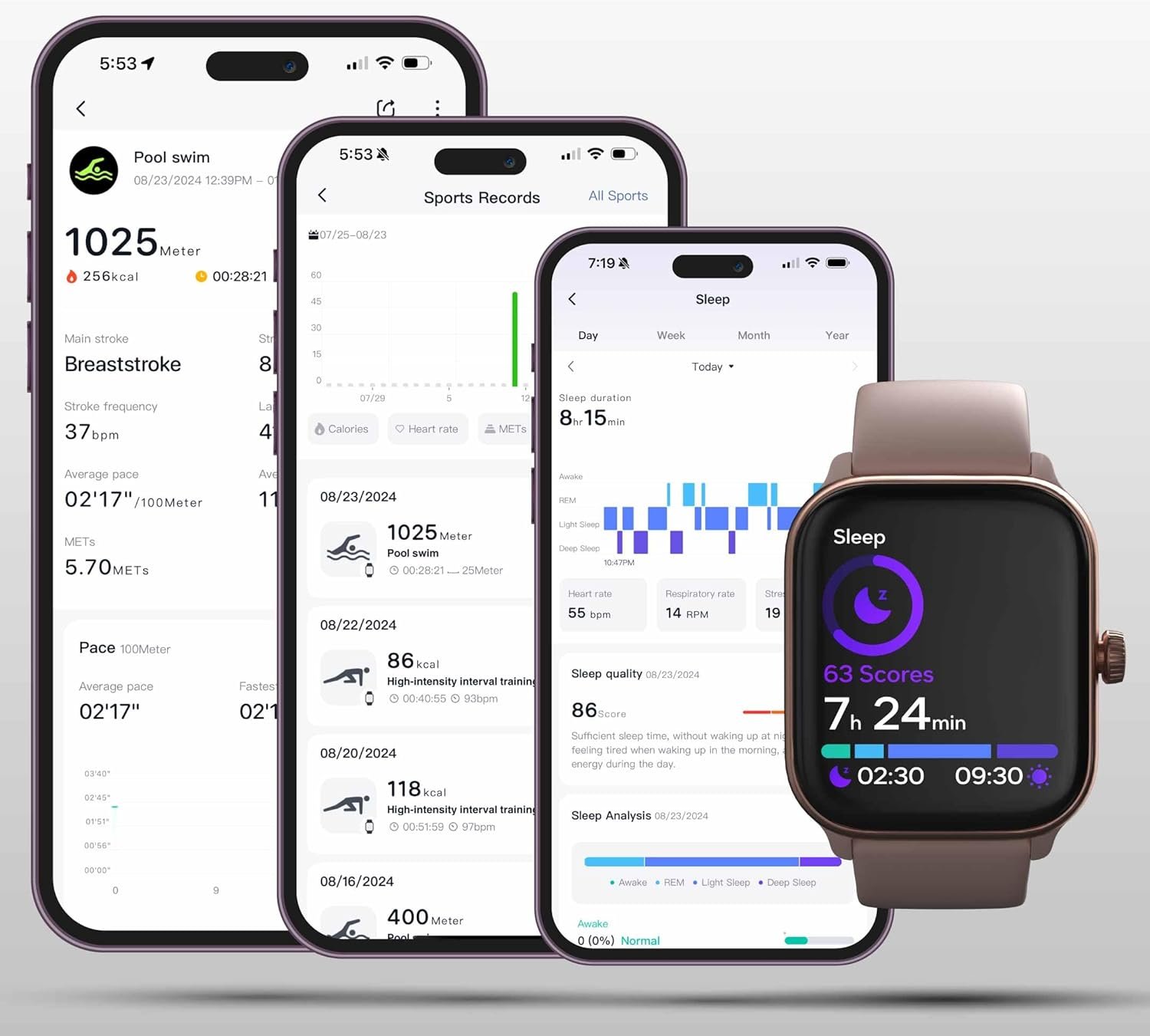 Customizable Watch Faces & Compatibility: Personalize your style with various watch faces, perfect for any occasion. Sync seamlessly with iPhones and Android smartphones with our 100% free app for smooth integration and enhanced data sharing.