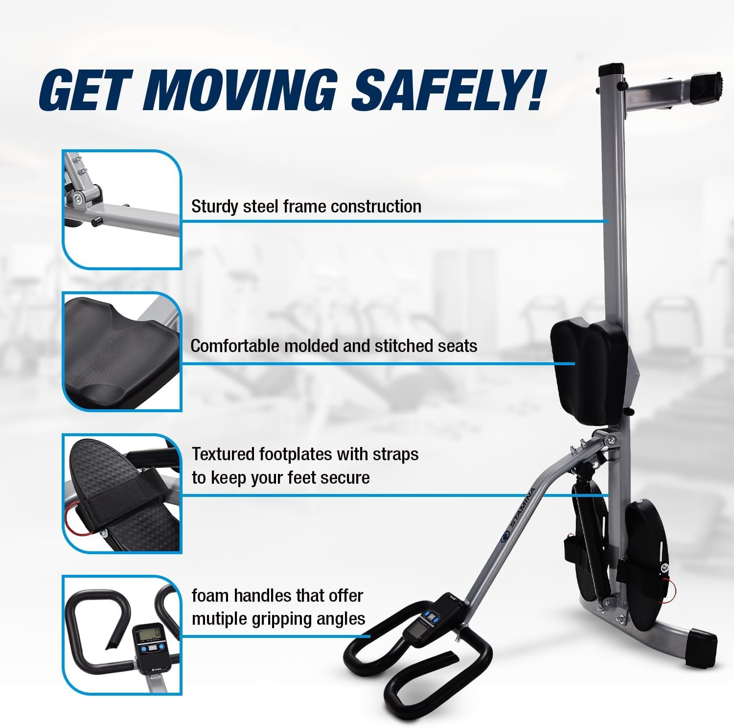 Safe and Comfortable – Built to last with solid steel, the Stamina Row Machine features a comfy, stitched seat, four resistance levels, and pivoting footplates with secure closures. Track progress on the InTouch monitor—it’s everything you need for a smooth, powerful row.