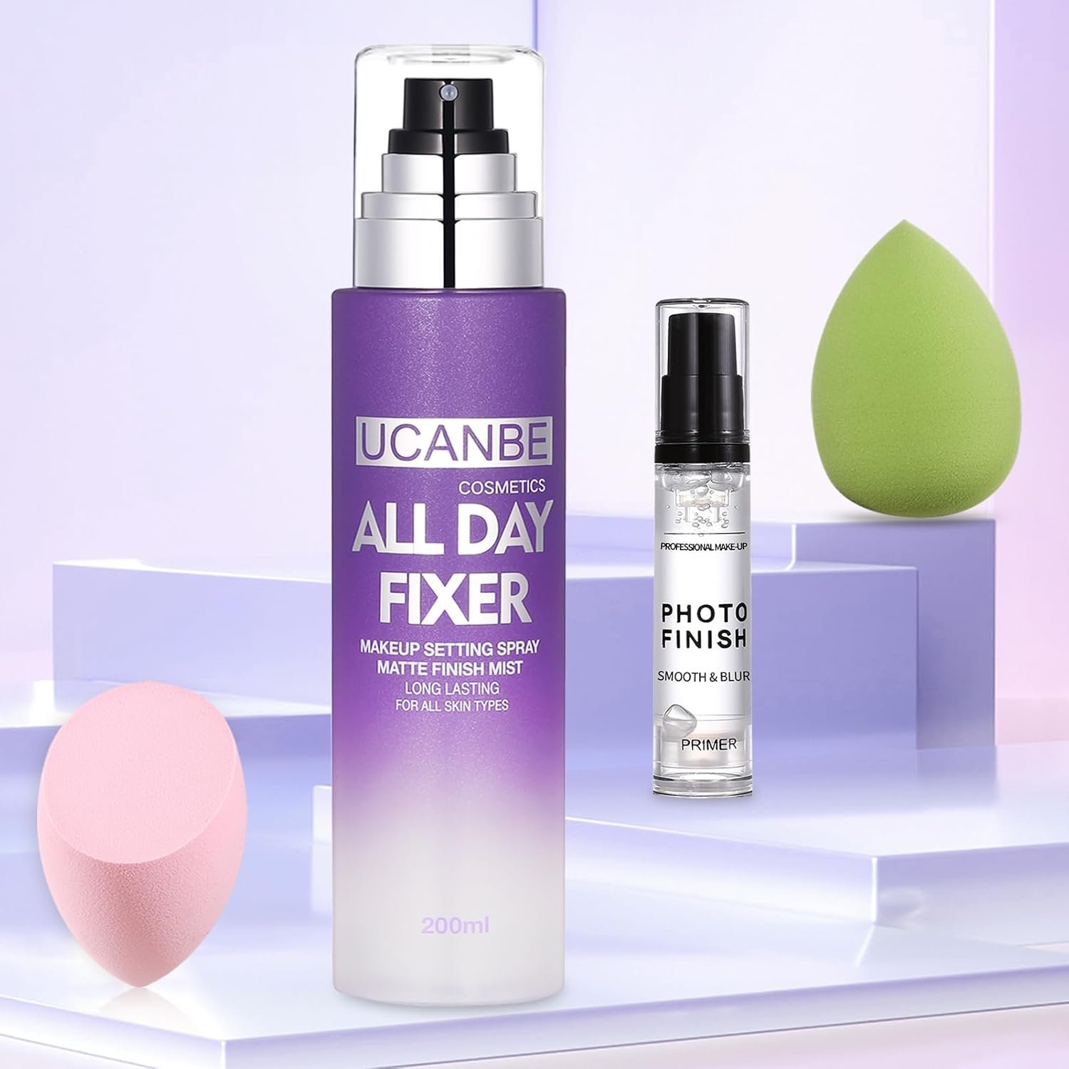UCANBE Makeup Setting Spray + Face Primer + Make Up Sponge, Gel-Based Hydrating Primer, Lightweight, Long Lasting Matte Finishing Spray,Beauty Blender Set