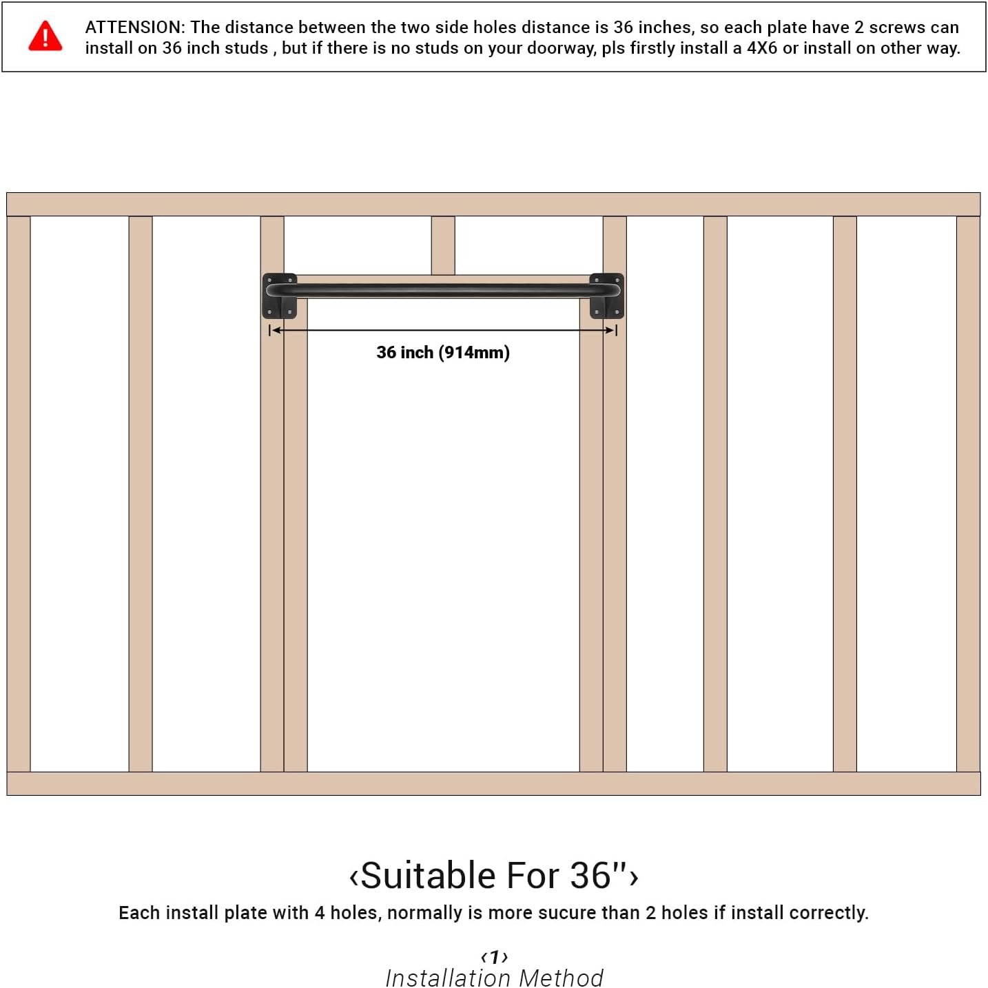 Sturdy and Reliable for Doorway Use: 4 mounting holes, normally more strong and stable than 2 mounting holes – With mounting holes center distance at 36″, just right for 36‘’ apart wall studs. perfect pull up bars for walls, doorways, and wood beams.