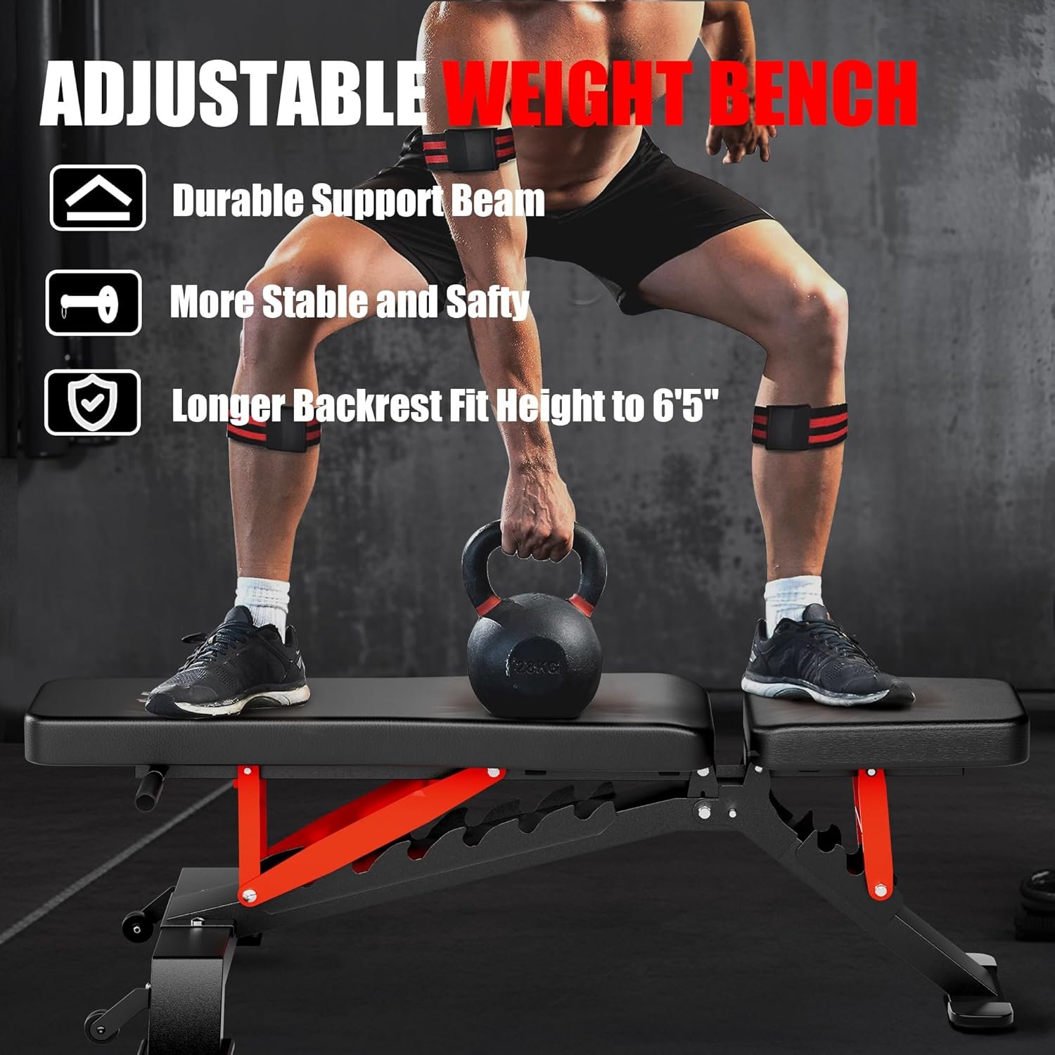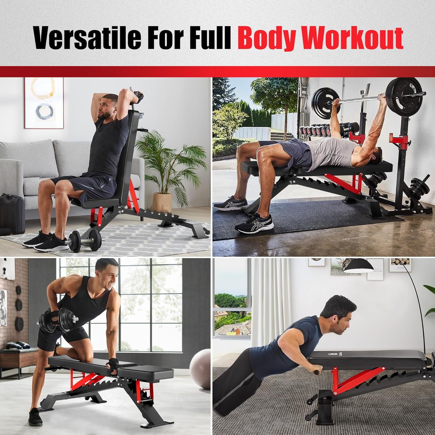 1300LBS Weight Capacity: With a sturdy triangular structure and solid, thick commercial-grade steel, our adjustable weight bench can support up to 1300lbs. Perfect for intense full-body workouts, it also comes with extra handles, providing more exercise options to help you reach your fitness goals. This heavy-duty bench is built to endure the demands of a commercial gym.